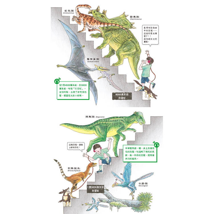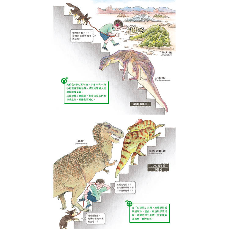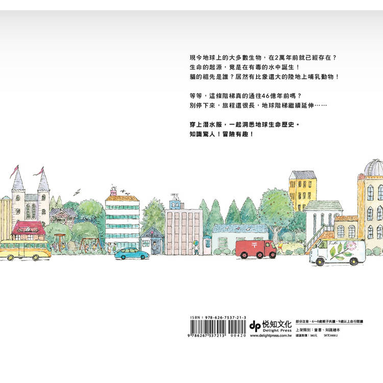 從下往上縱向翻頁,獨特風格的繪本。每翻一頁就像是在往下走樓梯,帶領我們回溯地球的過去。能夠回溯到46億年前,真是令人震撼!這本書讓我了解了地球的歷史,還有許多恐龍的出現,讓我感到非常有趣。(奇娜/40多歲;19歲女兒、16歲女兒、14歲兒子)