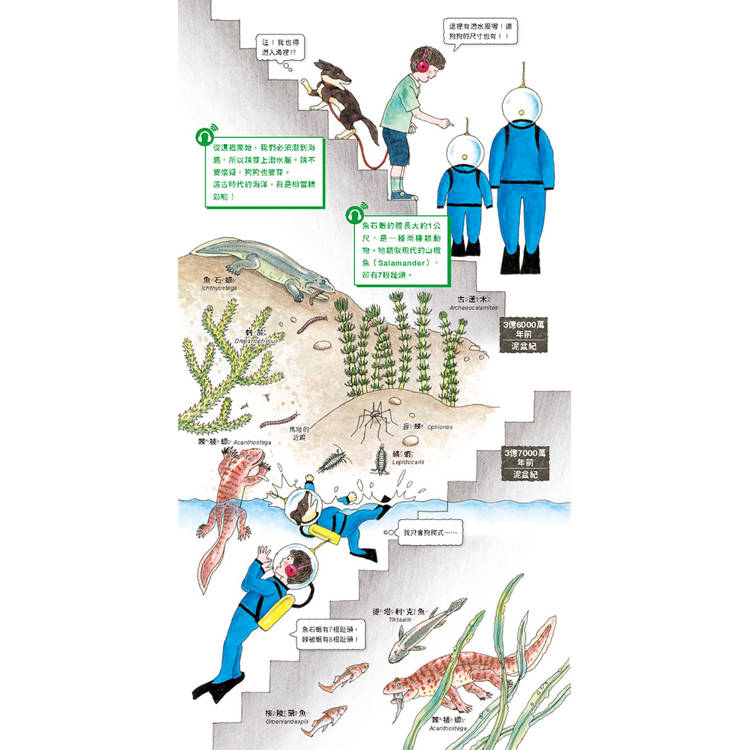 本科學繪本以縱向翻頁的方式,隨著主人公走下階梯,時代也一同回溯,獨特的設計激發了冒險之心。