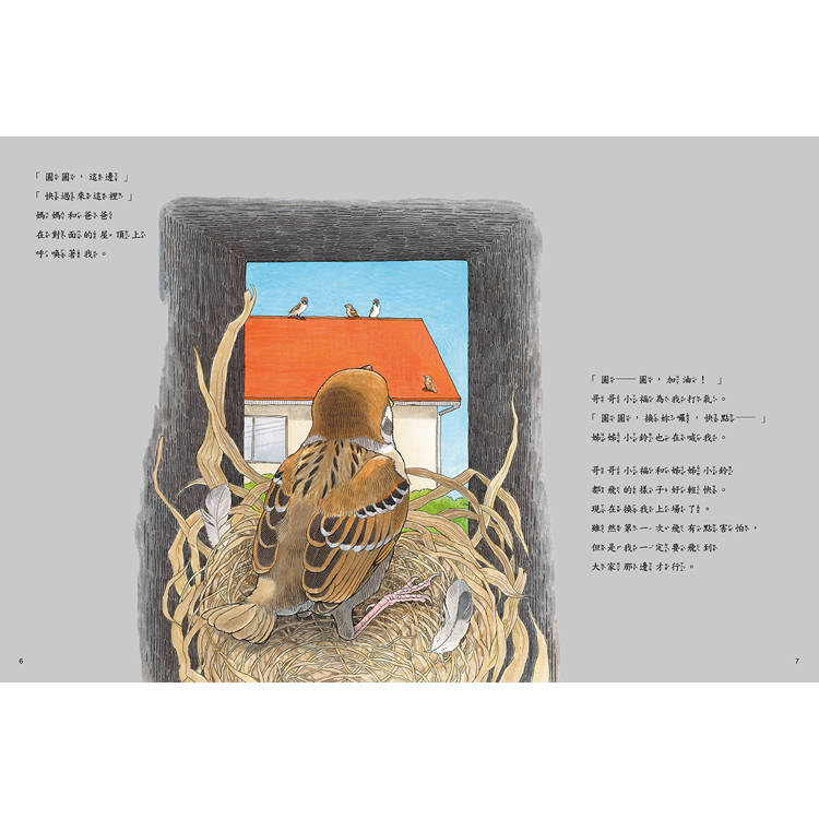從剛孵化的麻雀「圓圓」的視角出發,本書帶領讀者走進鳥兒的日常生活:從學飛、覓食、群居、築巢到育雛,真實而溫柔地描繪了麻雀在都市與自然間的生命旅程。