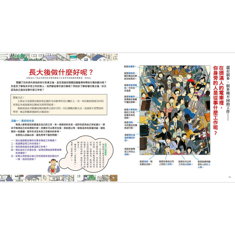 本書以豐富寫實的圖片,介紹了近三十種社會上具有代表性的工作,範圍涵蓋技術性、教育性、藝術性等多種面向,以訪談的方式,清楚地介紹了該工作的內容與所需要的技能,帶領孩子了解各種職業不同的性質、所需技能與工作甘苦談。從小開始嘗試著思考:「我喜歡做什麼樣的工作?為了從事這種行業,我需要哪些技能?因此又應該念哪方面的科系?參與哪些活動或訓練?」