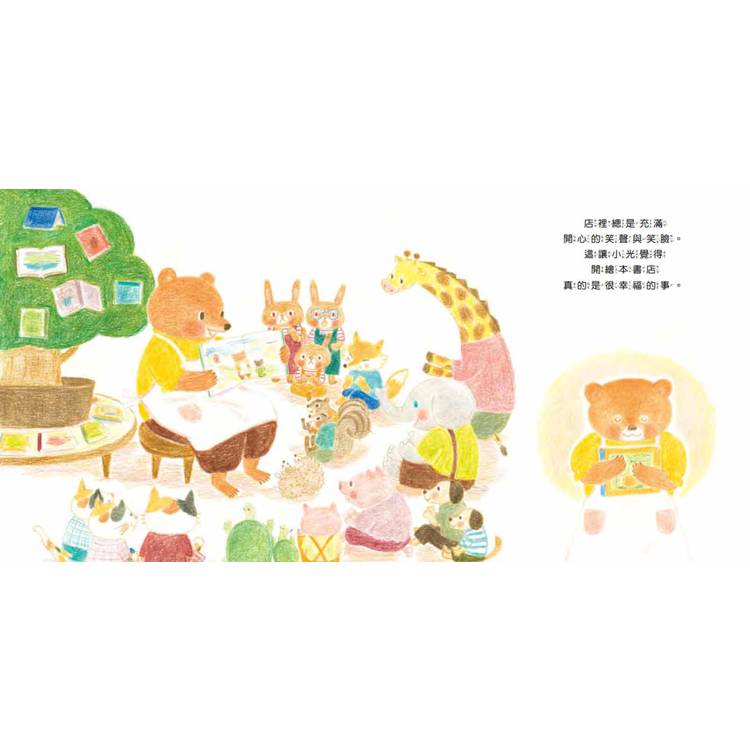 店主小光每天都很忙碌:幫象媽媽挑選讓孩子安心入睡的繪本;幫兔爸爸找和胡蘿蔔有關的有趣繪本……