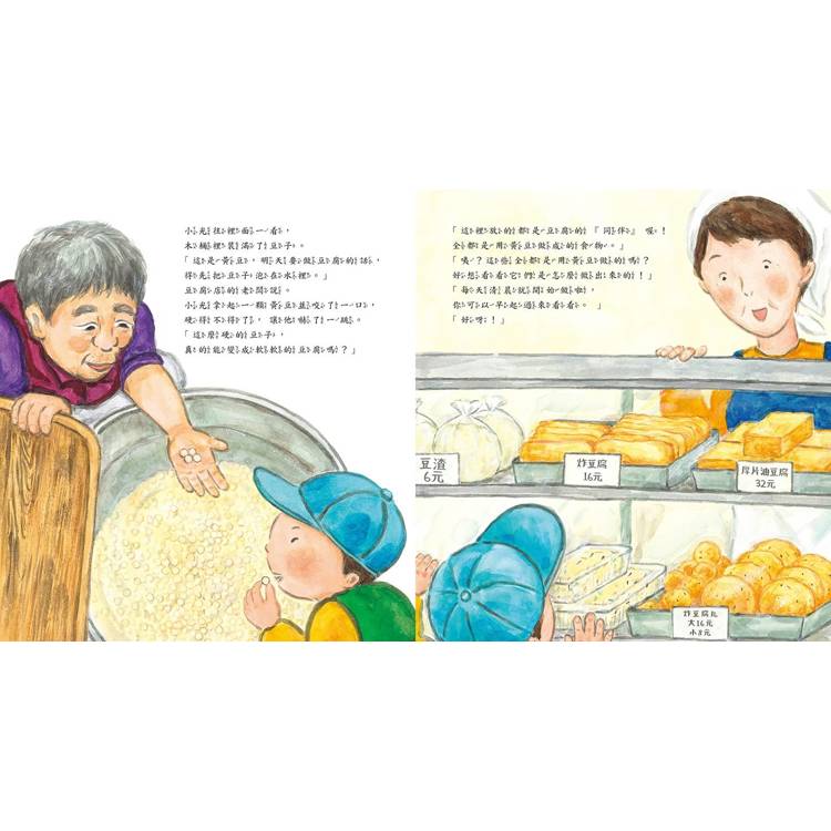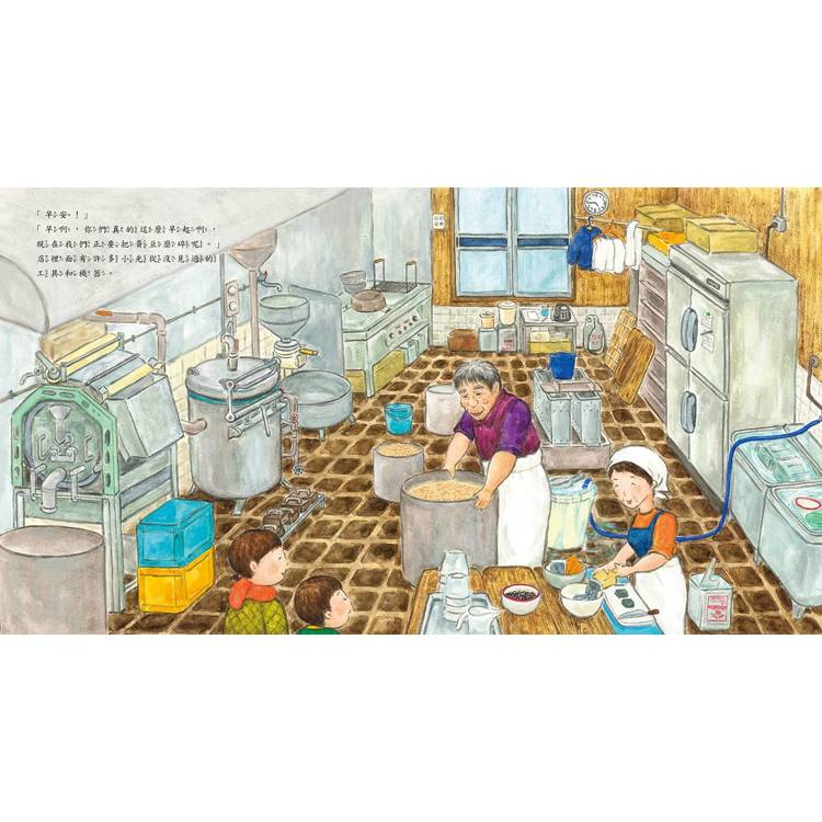 透過細膩的畫風與故事內容,運用清楚的圖示、步驟與程序,一目了然,讓孩子看圖就能理解黃豆如何變成豆腐,連製作豆腐的機器都畫得相當真實具體。從食材的來源開始,到成為食物上桌後的變化,清晰明瞭的展示給孩子看。讓孩子從頭了解一種食物的生產過程,開拓孩子的視野,提升認知概念。進而尊重與感謝製作食物的人,並學習珍惜食物。