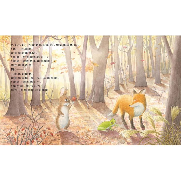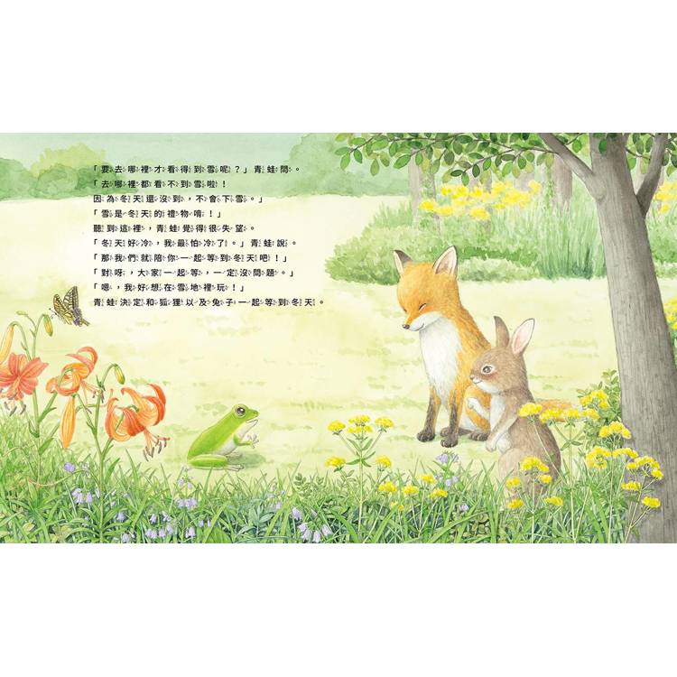 於是青蛙、狐狸、兔子就一起玩耍,約定等待冬天的到來,他們要一起賞雪。