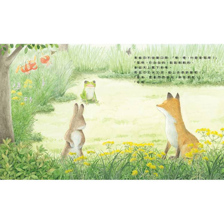 青蛙沒見過雪,好奇的問狐狸跟兔子什麼是雪?