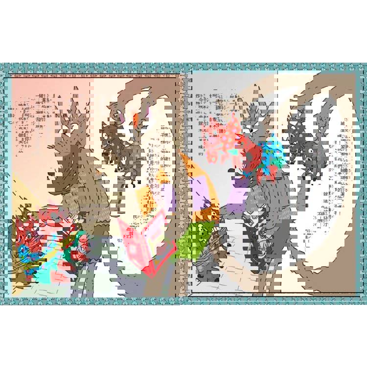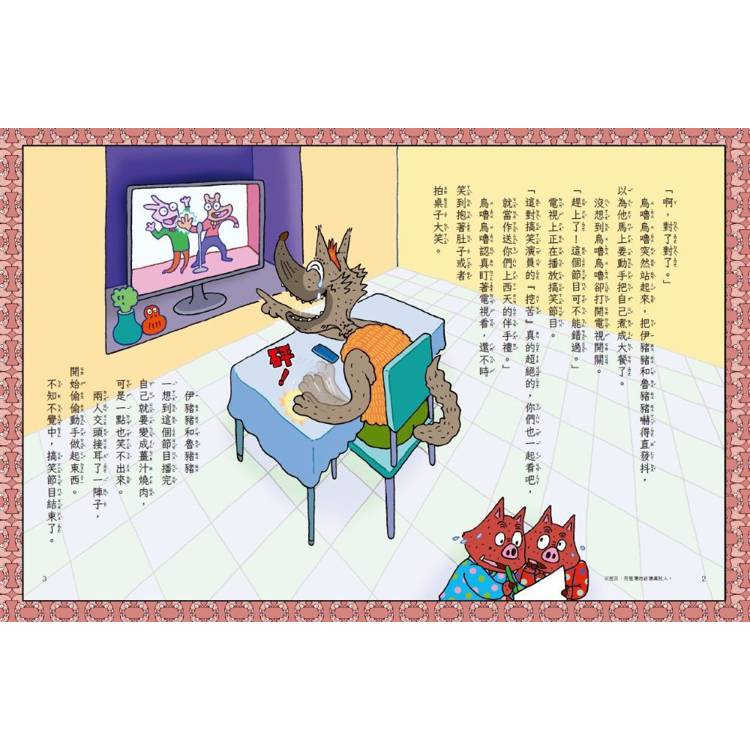 大野狼為了聽故事,只好暫時忍住大口吃肉的渴望……