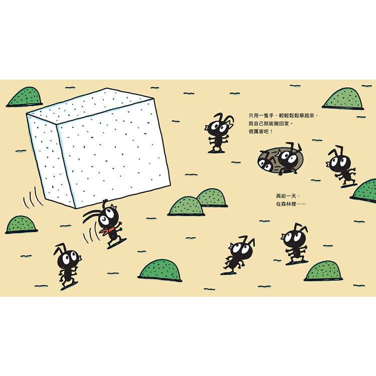 方方正正的方糖、圓滾滾的餅乾,甚至像球一樣大的糖果……其他小螞蟻怎麼抬都抬不動、怎麼搬都搬不起來的東西,我──只用一隻手,就能輕輕鬆鬆舉起來。