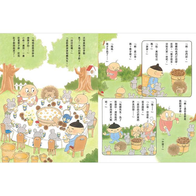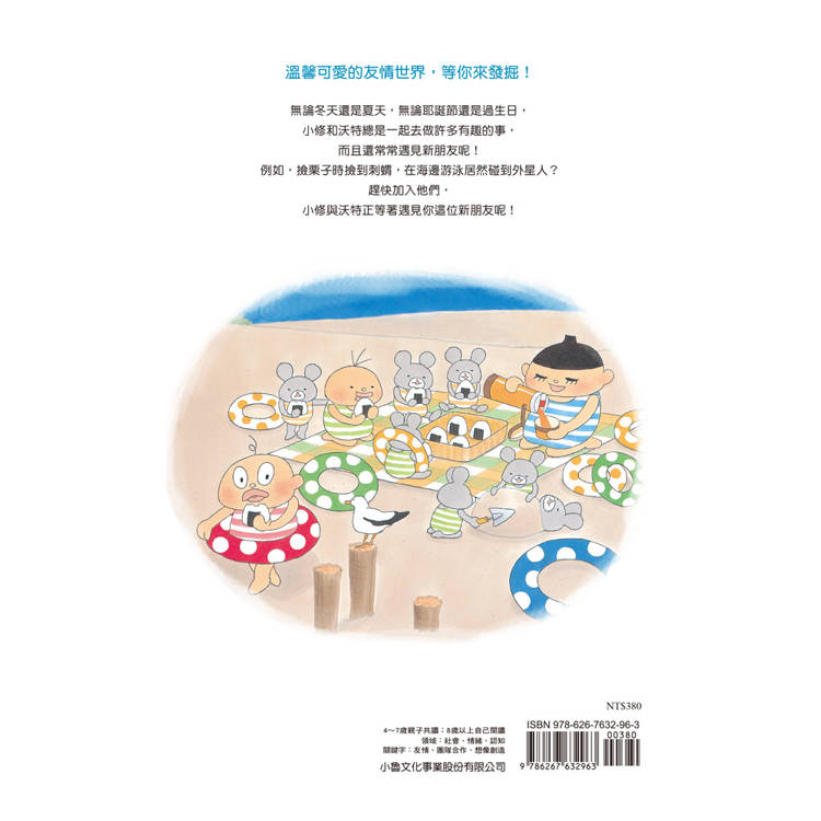 本書共收錄五則可愛的故事:〈上山撿栗子〉、〈過耶誕節〉、〈吃蛋包飯〉、〈打保齡球〉、〈海邊的朋友〉,小修與沃特正等著遇見你這位新朋友呢!