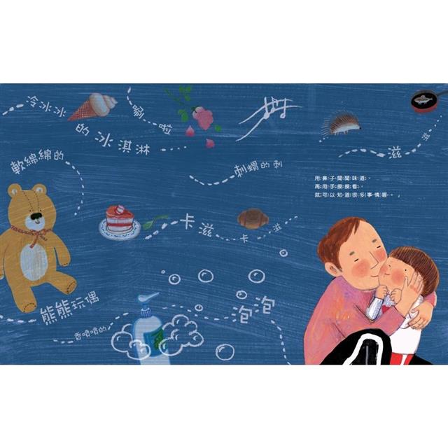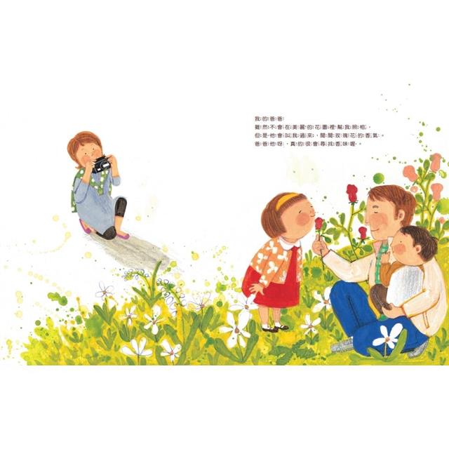 這本書一開始蝴蝶頁的背景,呈現了很多聲音,其實就是爸爸的世界。雖然爸爸不會開車,也不會拍照,但他有靈敏的感官,擅長尋找好的氣味。看著書中孩子滿足的表情,空氣中彷彿飄著玫瑰花的芳香。這是一個多麼親密的家庭!爸爸在家裡做了他能做的一切,也用自己的方式陪伴孩子玩捉迷藏,孩子強忍笑聲的表情真是太可愛了!而在黑暗中讀書是只有爸爸才能做到的超能力!很慶幸能夠讀到這麼溫暖的書。」YES24/cherry님