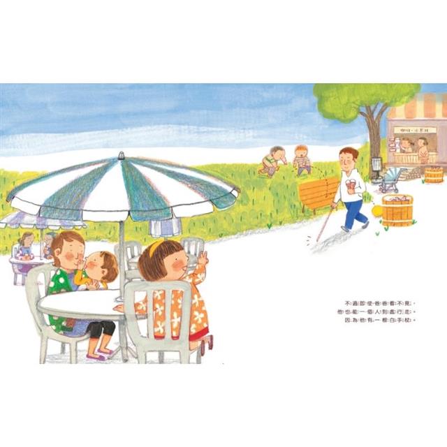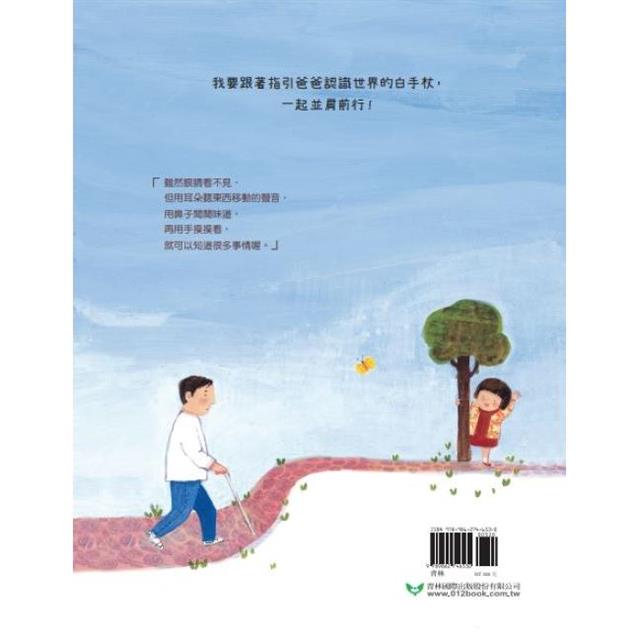 爸爸不會開車載我們去玩,也不會幫我們拍照。但他會跟我玩捉迷藏,也會講故事給我聽。爸爸說:「雖然眼睛看不見,但用耳朵聽東西移動的聲音,用鼻子聞聞味道,再用手摸摸看,就可以知道很多事情喔。」看不見也沒關係,我要跟著指引爸爸認識世界的白手杖,一起並肩前行!