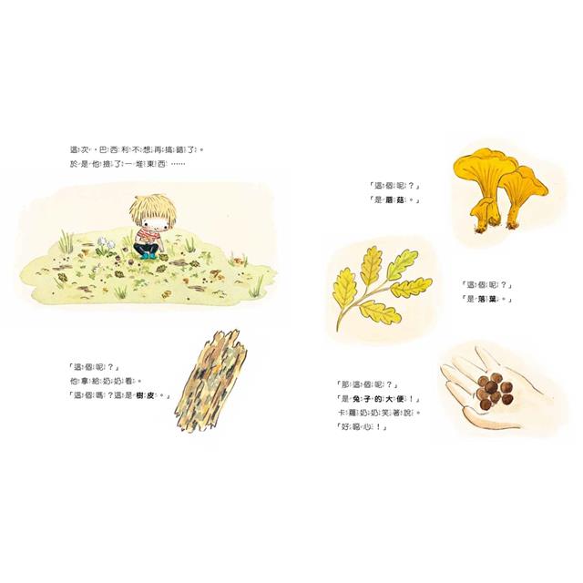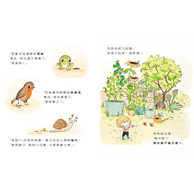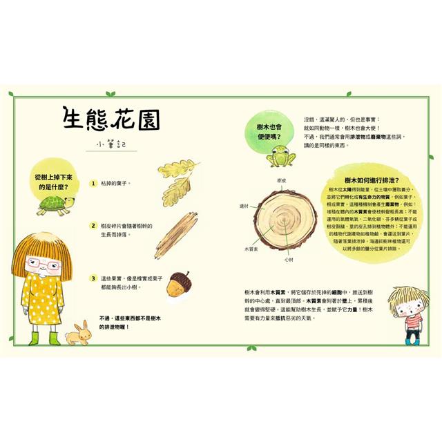 孩子常會關注周遭事物,並問大人「為什麼?」書中以童趣的畫風,透過祖孫互動問答,解答孩子的「為什麼?」書末更有「生態花園小筆記」說明植物如何生長、獲取養分與排泄等概念。
