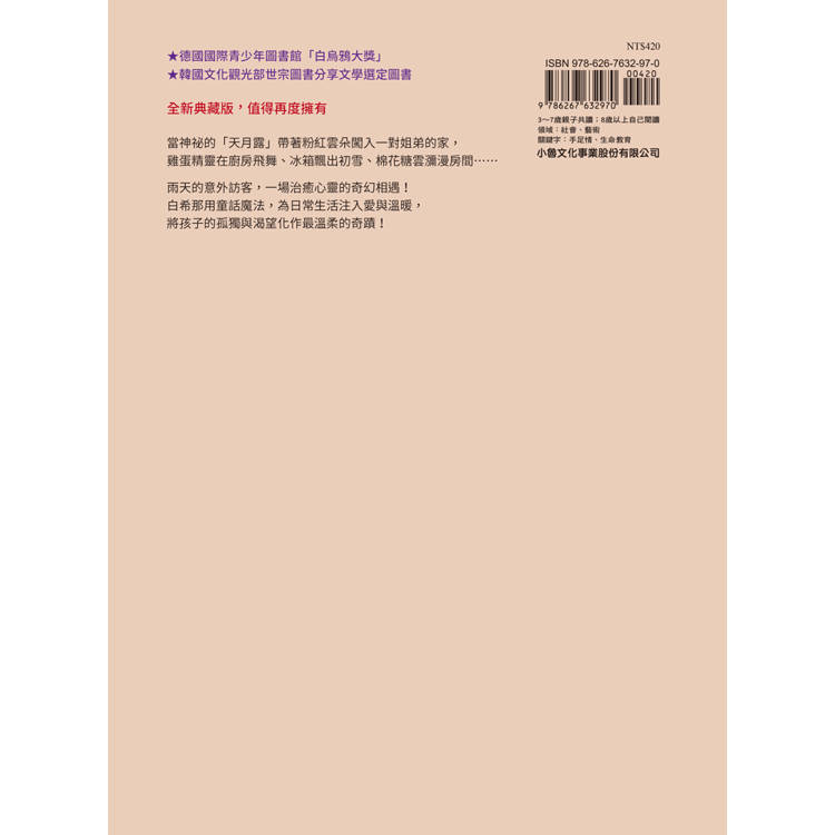 白希那的經典作品《奇怪的客人》全新改版上市,以更細膩的印刷品質與設計呈現她獨特的幻想世界。新版調整了版型比例,讓孩子更容易翻閱。畫面上光線、色彩與場景的細節也經重新校正,使故事的空間氛圍與情感張力更為鮮明。特別在封面上,「天月露」帶著粉紅背景現身,臉上還掛著一抹淘氣的笑容,彷彿下一秒就要闖進屋裡大鬧一場,全身散發出既可愛又讓人難以預料的調皮氣息。這位來自雲端的訪客,為姐弟的關係帶來魔法般的轉變。這是一場在雨天裡由孤單轉為驚喜的奇幻邂逅,再次顯明作者希望以故事的溫柔,照亮孩子與大人心底那份被遺忘的渴望。
