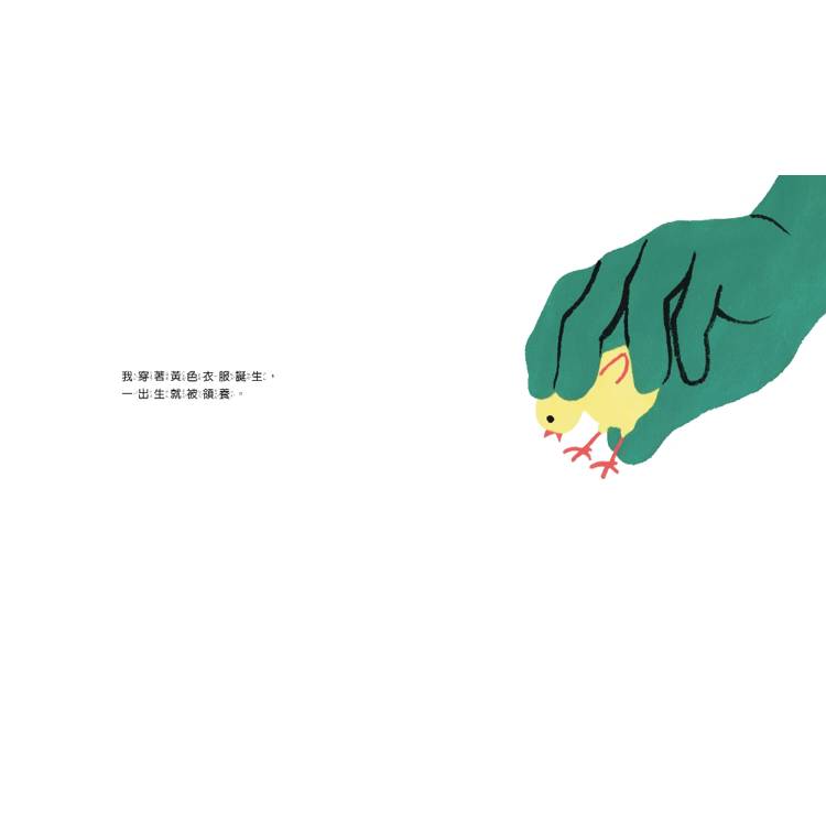 故事以一隻小雞的視角展開,描繪牠從出生、成長、搬遷,到成為產蛋母雞的一生。在連轉身都不被允許的擁擠籠子中,為了活下去、為了不挨餓,母雞們被迫彼此踩踏、互相攻擊,為了持續產出雞蛋,被迫斷食斷水,承受不人道的對待。本書希望引導讀者重新思考日常飲食中習以為常的「雞蛋」從何而來,以及我們的每一個選擇,如何與另一個生命緊密相連。