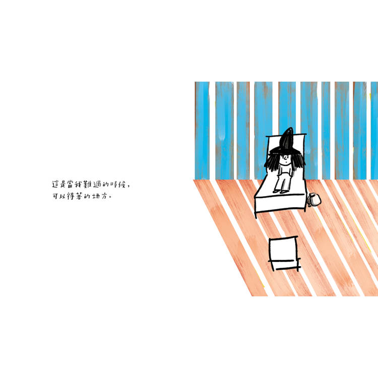 傷心、難過並不是不好的情緒,感到難過的時候也不一定要馬上振作起來,你也可以像主角一樣,選擇先和難過好好共處,安安靜靜的待在一個像難過小屋般的空間裡。