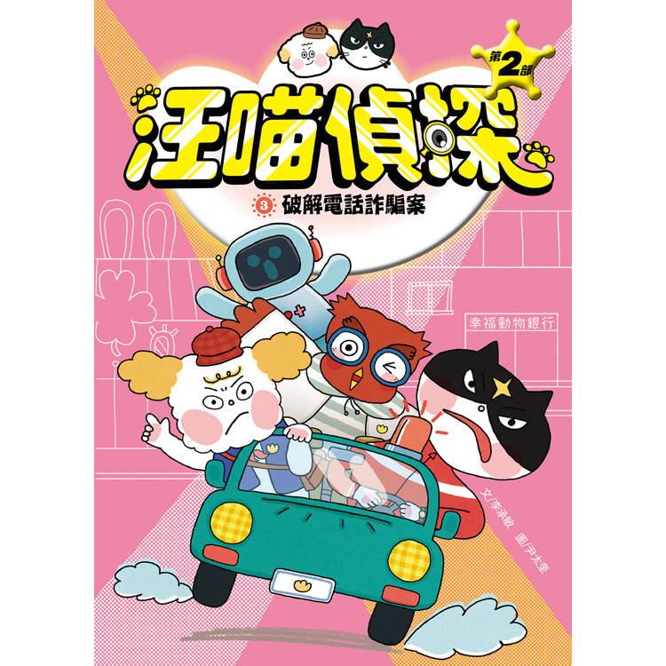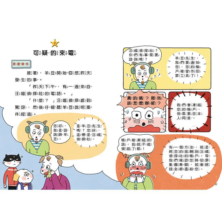 不得了!有人冒充汪喵偵探社的名義,把山羊先生帳戶裡的錢全都領光了!汪喵偵探接獲消息,明白這是一樁電話詐騙案,便立刻展開調查。他們首先抓到了無意間成為詐騙集團「車手」的老鼠吱吱,接著跟蹤形跡可疑的狼,進一步找出詐騙集團的各個據點。
