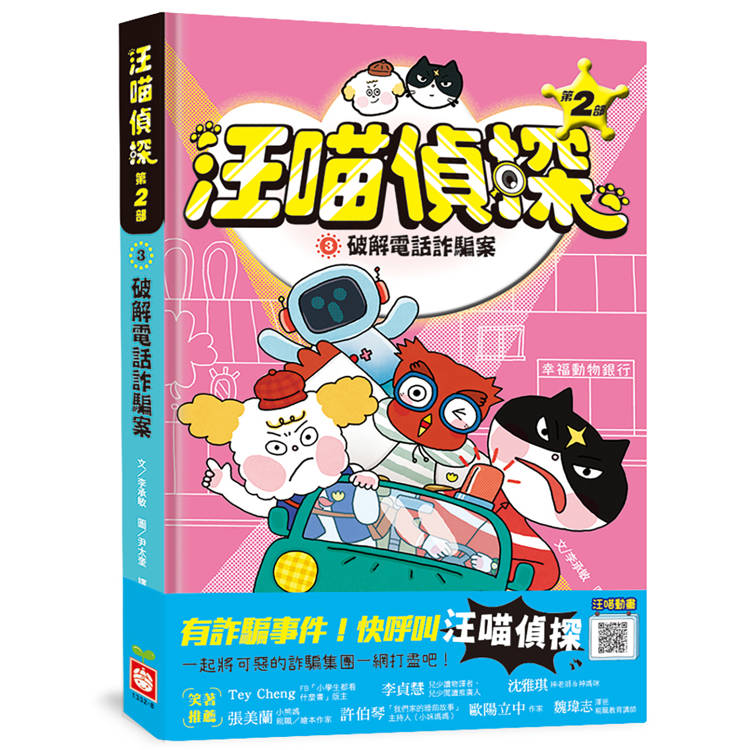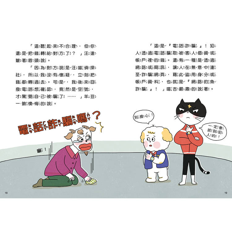 汪喵偵探是否能順利抓住所有詐騙集團成員,將壞蛋們一網打盡呢?現在就翻開書本,努力找出所有線索,跟著汪喵偵探一起破解案件,解除動物小鎮居民的詐騙危機!
