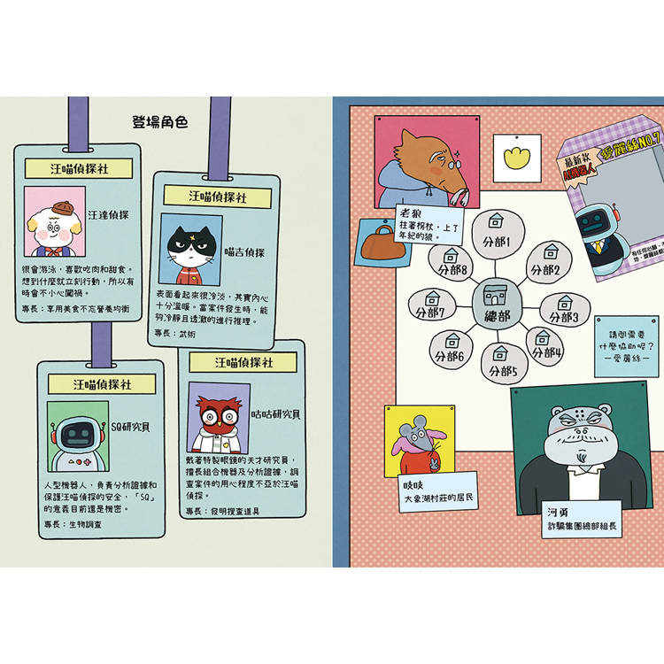 說到汪喵偵探,就會想到嗅覺超靈敏的「汪奇」和身材圓滾滾的「喵嗚」,這對最佳拍檔攜手偵破大大小小,高達502個案件後,決定正式退休啦!那麼,「汪喵偵探社」會從此消失嗎……當然不會,因為他們創立了「汪喵偵探學園」,培育新一代的汪喵偵探,而熱愛美食的「汪達」和武術高手「喵吉」就是第一屆的畢業生,他們接替了汪奇和喵嗚的搜查工作,繼續守護動物小鎮的和平!現在,請你跟著第二代汪喵偵探──汪達和喵吉,一起搜查各種神祕案件吧!
