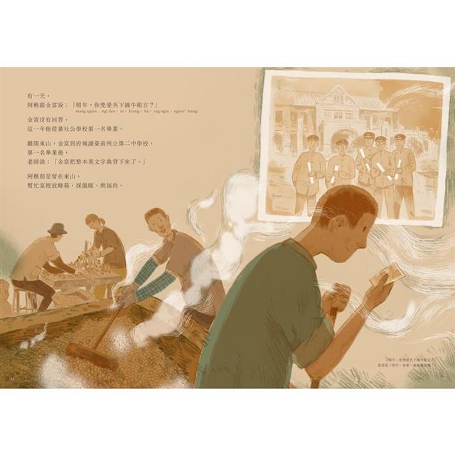 寫作這本繪本,就像一場尋根之旅,帶我找到記憶中往東那座沉默的山,也找出了我困惑已久的答案。原來這座山並不沉默,淺山煙蘊之間裡面生氣勃勃:無數的蜜蜂辛勤採蜜、每年立秋之後開始「焙龍眼」,山上各處的焙灶寮燃起了就地取材的龍眼木,甚至幾十天都不會熄!阿公也並不沉默,他的童年裡或許有著阿姆還帶著客家詞彙的輕聲叮嚀,而他沒來得及跟兒孫聊的那些話語,也原原本本的凝聚在祖厝與鄉土之中。