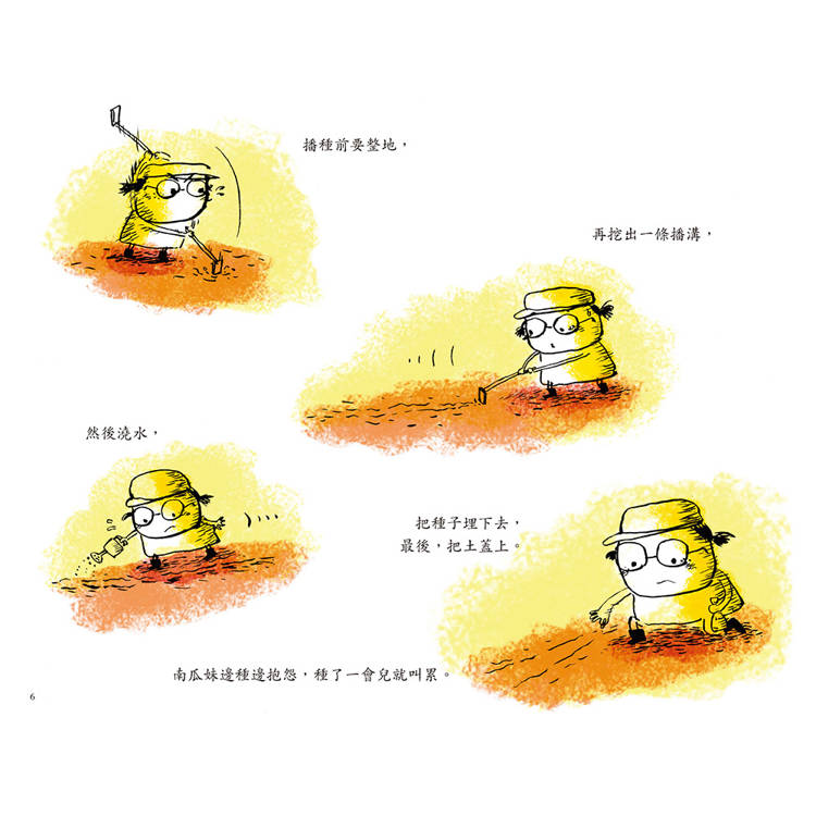 在這本書中,我透過一顆神祕的種子,帶出南瓜妹的心情轉變。她是個道地的都市小孩,喜歡薯條、漢堡,缺乏勞動,又不願親近土壤。當她的家人在菜園裡耕種時,她總是坐在遠遠的樹蔭下,一副事不關己的模樣,直到瓜婆婆給了她一顆神祕的種子,她的態度慢慢改變了。