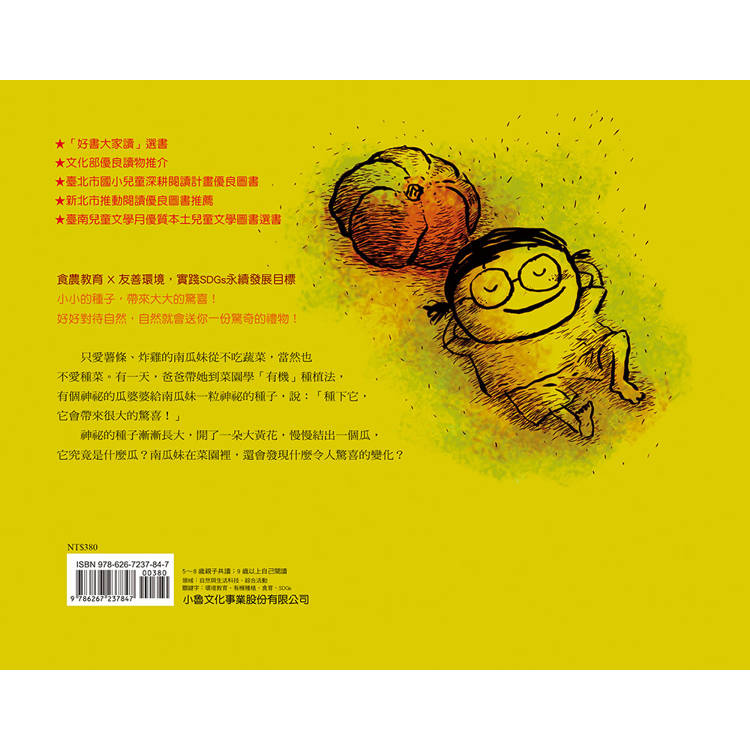只愛薯條、炸雞的南瓜妹從不吃蔬菜,當然也不愛種菜。有一天,爸爸帶她到菜園學「有機」種植法,有個神祕的瓜婆婆給南瓜妹一粒神祕的種子,說:「種下它,它會帶來很大的驚喜!」