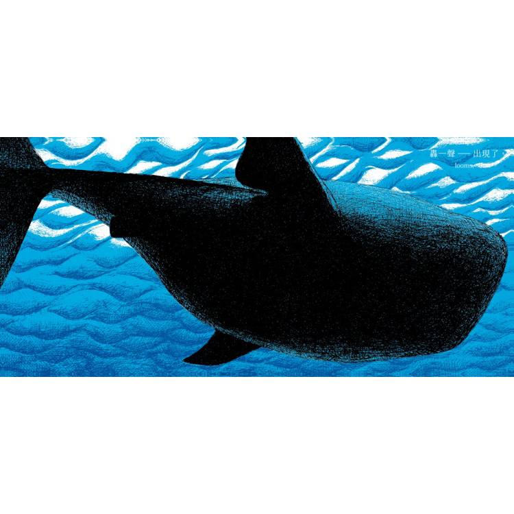 在如絲絨、如夜空沉穩變換的藍色世界裡,我們的目光不禁隨著新宮晉的黑色點線持續切換運鏡:仰望、鳥瞰、平視,時而局部近焦鯨鯊那雪白的腹肚、時而遠觀牠整體如雪花般的背脊,眨眼間化身為即將被吞入腹的皮諾丘,轉瞬又回復成徘徊於牠身側的渺小人類……