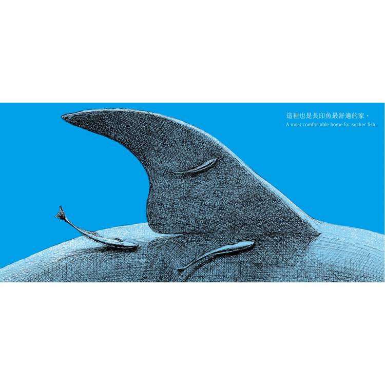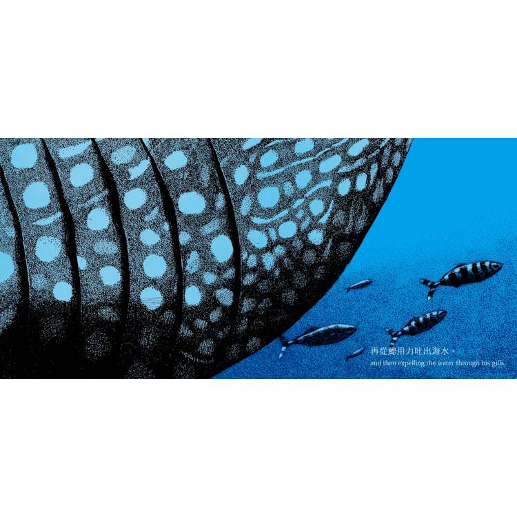 「鯨鯊,現今地球上既有體型最大的魚,全長約十八公尺,體重據說可到四十公噸。牠們一邊吞掉大海中的浮游生物,一邊以接近人類走路的速度(平均時速四公里),在世界各處的暖流海域緩緩游動。以前的漁夫都很愛看到鯨鯊出現,因為那是豐厚漁獲的象徵。」(摘自《鯨鯊》後記,新宮晉)