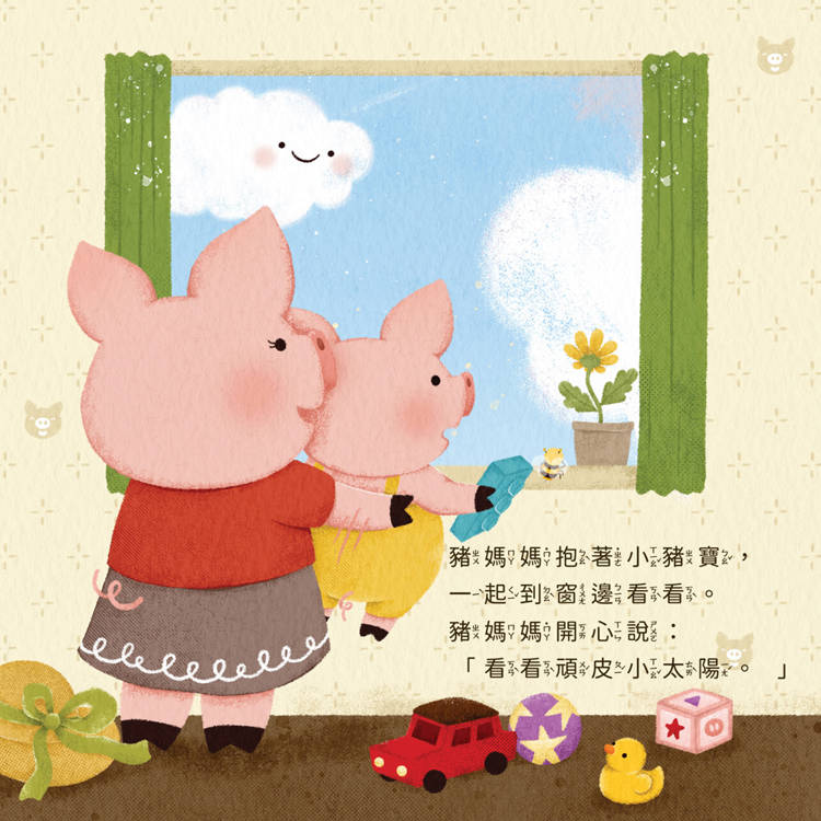 畫面中也特別加入了許多小彩蛋,像是穿梭於其中的小蜜蜂、藏著豬鼻子的各種物件、在山坡遠處散步的小兔子、豬爸爸下班後點起了燈等豬媽媽和小豬寶返家……。大家在閱讀故事主線之餘,可以一起來找找畫面中有趣的地方!