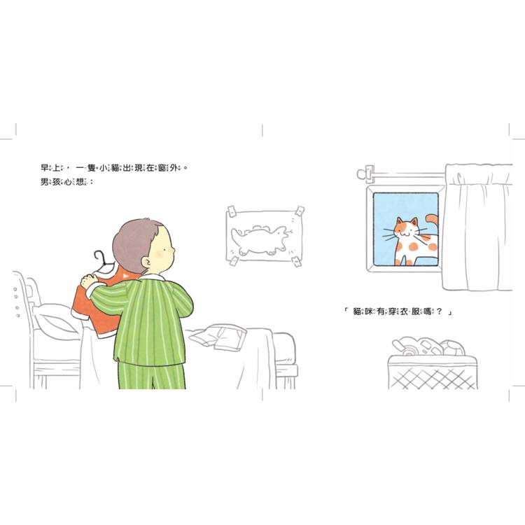 * 透過小男孩觀察世界的視角,「○○有穿衣服嗎」的純真提問,帶領大小讀者觀察生活周遭、以及世界萬物的「衣服」。
