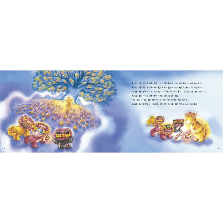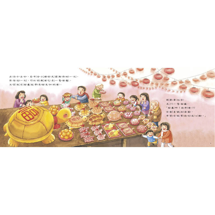 作者的話 在國外的故事中,常會描寫當地森林中的精靈,讀到這樣的書時,我總是想像著,在我們文化中也有不少的精靈,如劍獅、太極中的黑白魚、乞龜、虎爺、風獅爺、土地公等,它們都是我們民間信仰幻化出來的精靈,為我們祈福保平安。像以糕點的形式做成的祭祀品「乞龜」,它們被塑造出五花八門的造型,各個生動活潑,好似具有生命力,隨時會在我們不注意時,像精靈般的施展魔法。我特別喜歡早期老師傅們所製作出的造型,樸拙而有趣味。