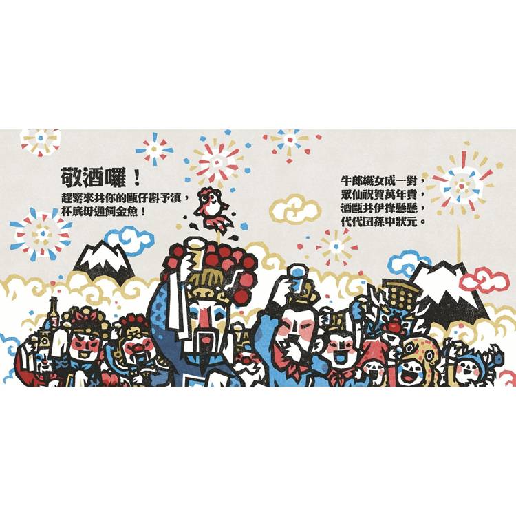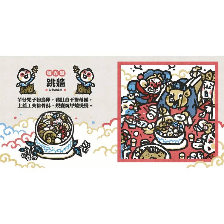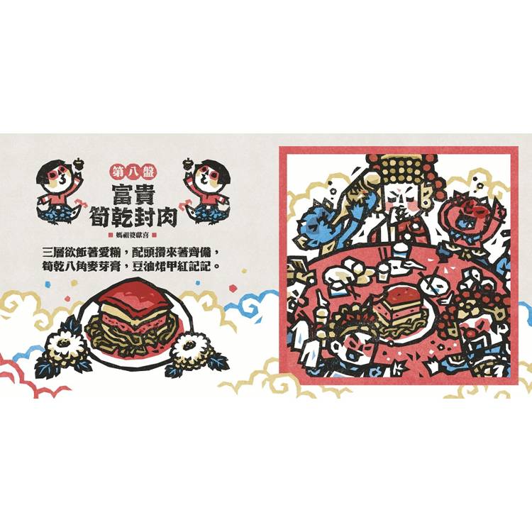 洪福田以二十四幅精美版畫,描繪傳統辦桌常見的代表佳餚與神仙享受美食的逗趣場景。另更有多幅生動可愛的版畫插圖,處處藏有驚喜彩蛋,值得細細欣賞!