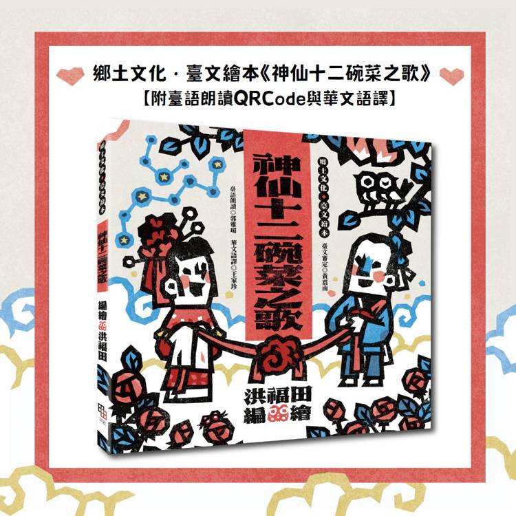 版畫家洪福田以臺語編寫《神仙十二碗菜之歌》念謠,透過仙界辦桌的故事,讓臺語與美食結合,以最接地氣的形式,傳唱鄉土文化,並完美結合既富傳統文化底藴又富現代感的版畫創作,獻給這塊土地上的每一個人。