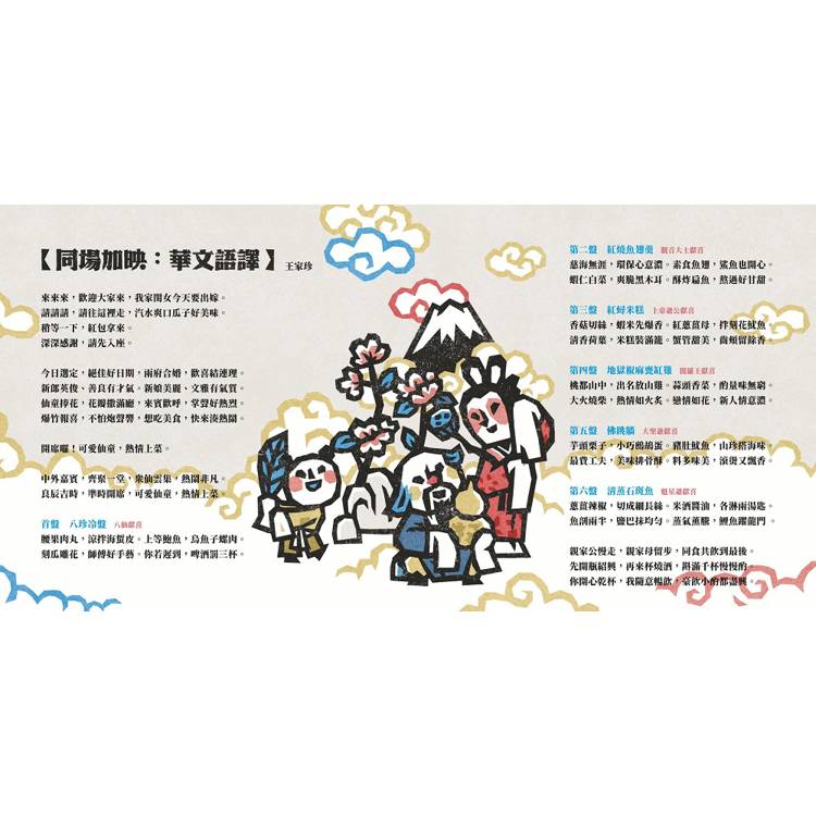 以臺語寫的十二則介紹美味佳餚的短篇韻文,不但介紹烹調方式與食材,也帶我們認識每道菜象徵的祝福,例如象徵新人愛意濃烈的麻辣甕仔雞、夫妻好合的海鮮雙拼、長命百歲的烏骨雞……這些韻文念來順口有節奏、讀來有趣又喜氣!
