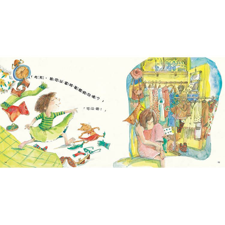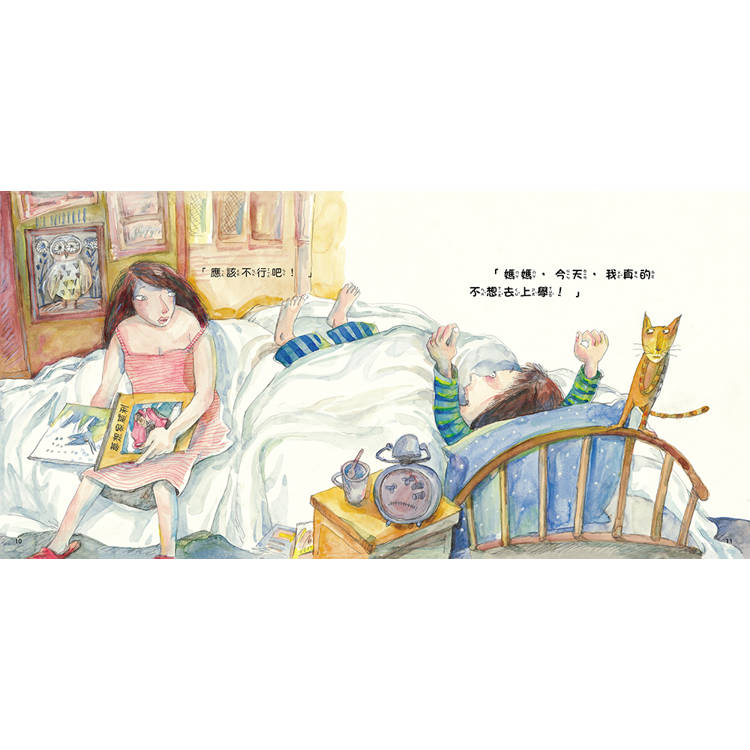 有一個愛看書的孩子,她每天晚上睡覺前都一定要看書,於是,那些書就來到她的夢裡。她會在夢裡「咯咯咯」的笑出聲,隔天早上起床後,問她笑什麼,她告訴我她飛起來了,像雅各一樣飛起來了。接著,她抓了幾朵白雲做雲朵麵包,還騎上魯拉魯先生的自行車……有時候,她會在床上滾來滾去躲著你,假裝賴床,故意閉著眼睛,卻閉不上笑意滿滿的小嘴。於是,我轉身假裝要離開,並且說:「好吧,今天不上幼兒園了。」此時,孩子便會立刻翻身坐起,一臉認真的說:「我跟妳說,我夢見天上在下書雨,硬硬的書砸到身上很痛耶!」「我跟妳說,我夢見奶奶掉進水裡,獅子跑來救她,老虎也來了……這是真的,妳相信我吧?」她邊說邊拿起昨天晚上讀過的那本書。沒錯,正是閱讀點燃了孩子的夢,就像《今天,我可以不上學嗎?》裡的露西一樣。感謝那些美好的書,感謝那些美好的相遇。