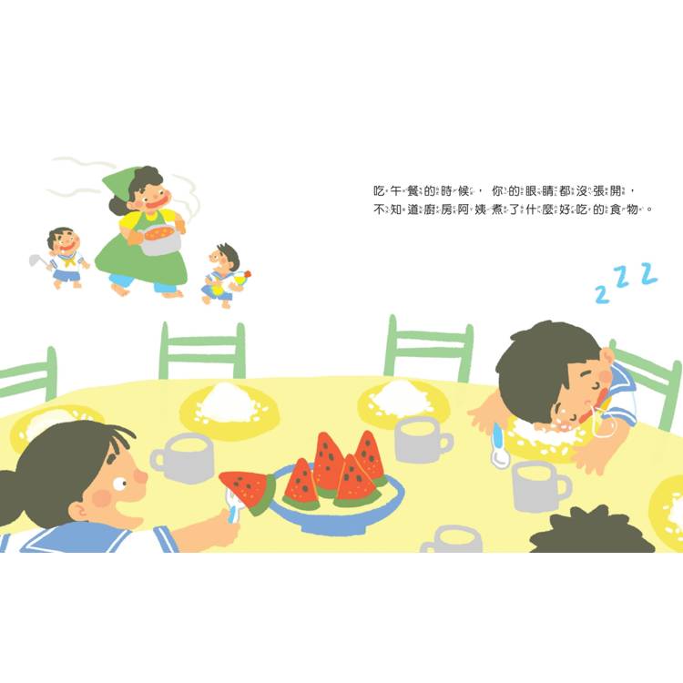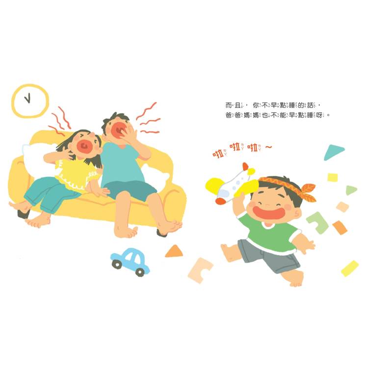 透過繪本共讀,描繪生活日常,開啟親子對話,讓孩子具體了解:如果沒有早點睡,隔天精神不繼,在幼兒園裡就無法好好享受說故事時間、遊戲時間、午餐時間……,也讓無法早點睡的媽媽爸爸上班沒精神、下班後也沒有力氣再陪伴孩子一起玩了。可以說,沒有「早點睡」所引發的效應,可能是一場讓全家人精疲力盡的惡性循環呢。反之,如果孩子們可以早點睡,不僅能有滿滿的活力迎接新的一天,盡情享受每個活動的樂趣,更可以避免上述狀況,讓親子關係正向循環。