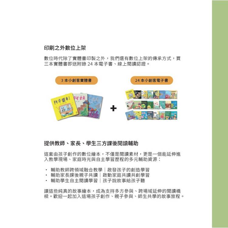 本套書包含3 本實體書與 24 本原音、配樂雙版本電子書,集結 24個孩子親自創作的故事,將透過同齡人的故事來啟發所有小讀者:原來我也可以寫、可以畫、可以說出自己的故事!