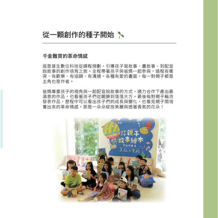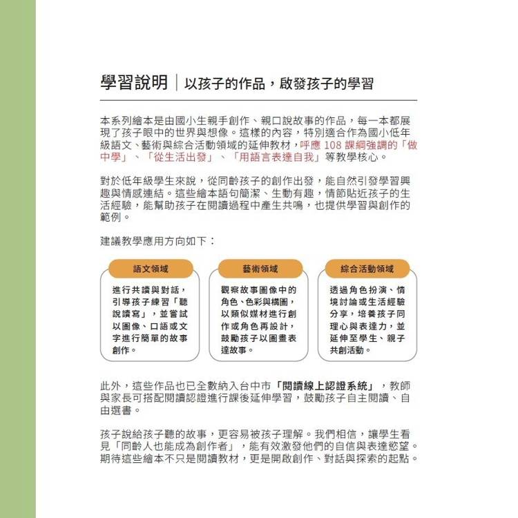 本套書將閱讀從單純的知識吸收,轉化為創造力與表達力的輸出。孩子藉由閱讀同齡人的故事,獲得「我也能創作」的自信,培養從愛聽故事到會說故事的素養。此跨領域學習案例整合了語文、藝術(視覺化創作)和科技(數位媒介應用)等多項核心能力,旨在培養 AI 世代不可取代的「想法」和「創造力」。