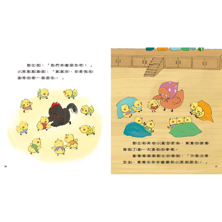 小雞酷比雖然感到害怕,仍然勇敢站出來,陪在小黑身邊。漸漸的,酷比成為小黑的好朋友,其他小雞也開始願意親近小黑。