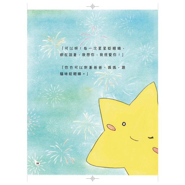星星說了:「爸爸、媽媽會難過,會很想念、很想念我們。因為他們很愛我們,那些眼淚和傷心……都是愛的另一種樣子。」……「每一次星星眨眼睛,都在說著,我想你,我很愛你!你也可以對著爸爸、媽媽, 跟貓咪眨眼睛。」