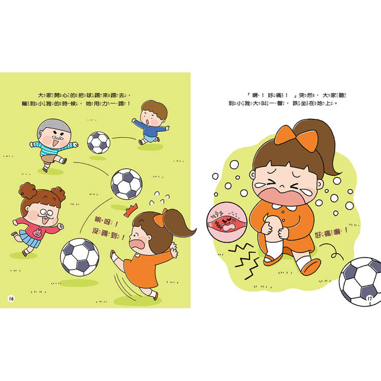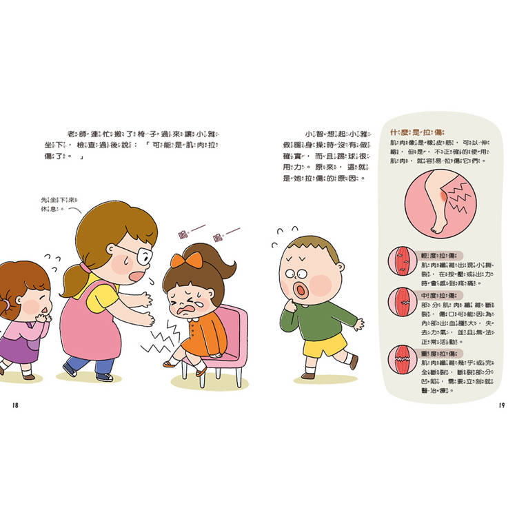 小雅一早懶洋洋的,上學還遲到了,老師帶大家做熱身操準備運動,小雅也做得不確實,開始踢球後,肌肉就拉傷了!肌肉受傷該怎麼處理?