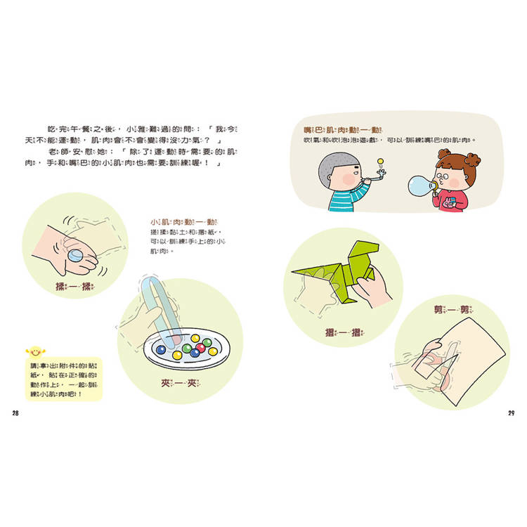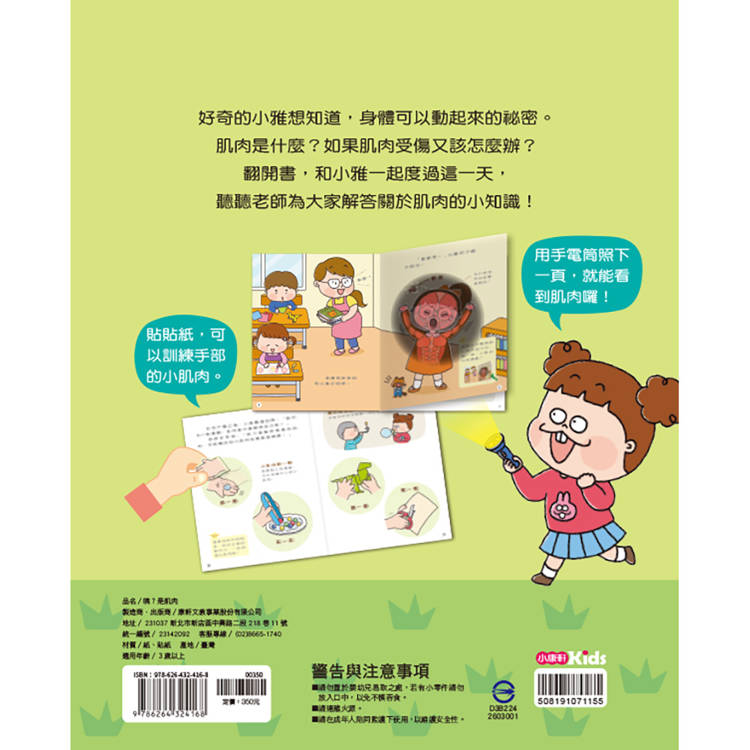 小朋友正在成長,身上的大肌肉、小肌肉都是必須每天鍛鍊的部位。本書透過生活化的故事情境,讓孩子知道身上的肌肉需要多多運用,並攝取幫助成長的營養,才能安心長大。