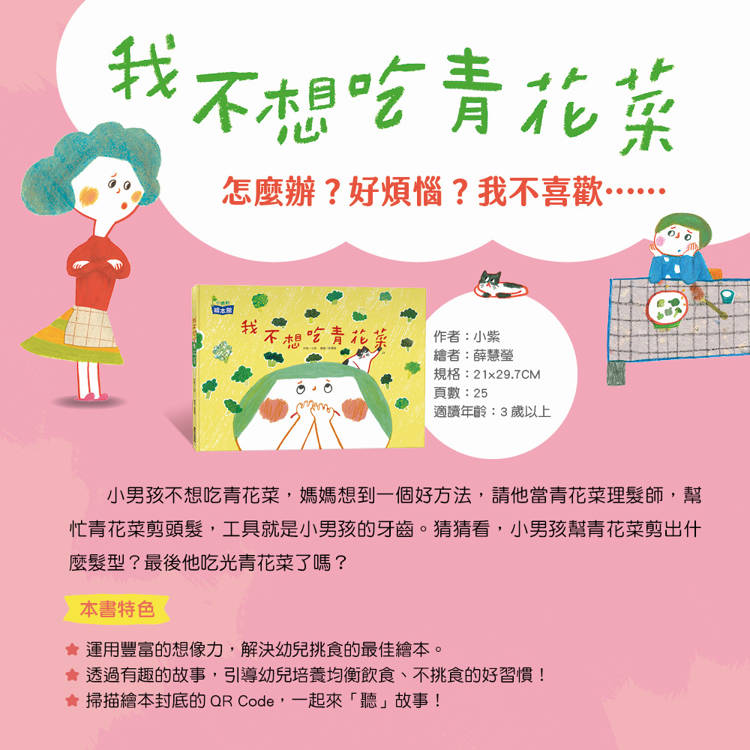 小男孩不想吃青花菜,媽媽想到一個好方法,請他當青花菜理髮師,幫忙青花菜剪頭髮,工具就是小男孩的牙齒。猜猜看,小男孩幫青花菜剪出什麼髮型?最後他吃光青花菜了嗎?
