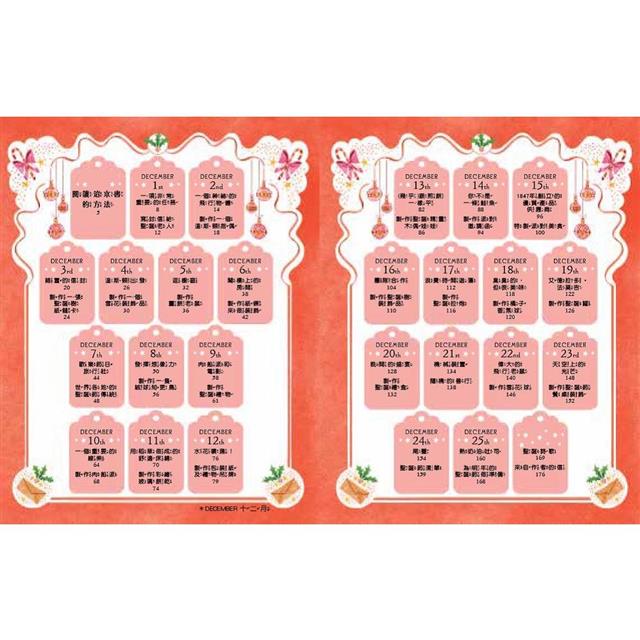 這本書一共有25篇故事,你可以從12月1日開始閱讀,每天讀一篇,到聖誕節正好讀完,而且每天還有一個超有趣的DIY慶祝活動喔!快讓我們一起來幫助小男孩,度過一個溫馨美好的聖誕節吧!