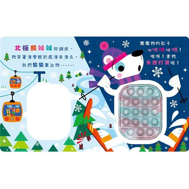 本書結合了風靡兒童界的神奇玩具pop it彩色矽膠板,按下去就可以享受戳破泡泡的療癒感,而且大小寶貝都能玩!