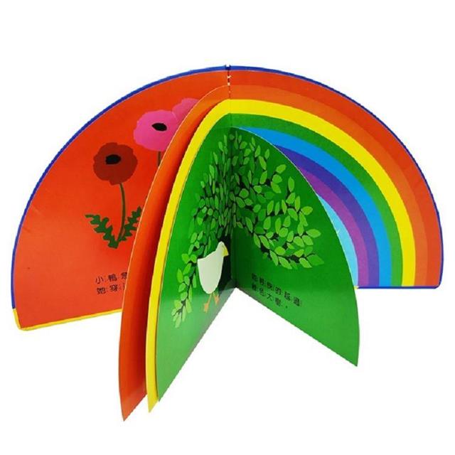 一開始的整體設計是四分之一的圓,當孩子們打開封面開始閱讀時,這個四分之一圓會加倍變成半圓。當讀者跟隨這位長著羽毛的小鴨一步步踏上旅程時,這本圖畫書不斷的發生變化:書頁尺寸雖然逐漸縮小,但畫面卻慢慢發生改變,最後甚至形成一條巨大的彩虹,彷彿橫跨了整個世界。