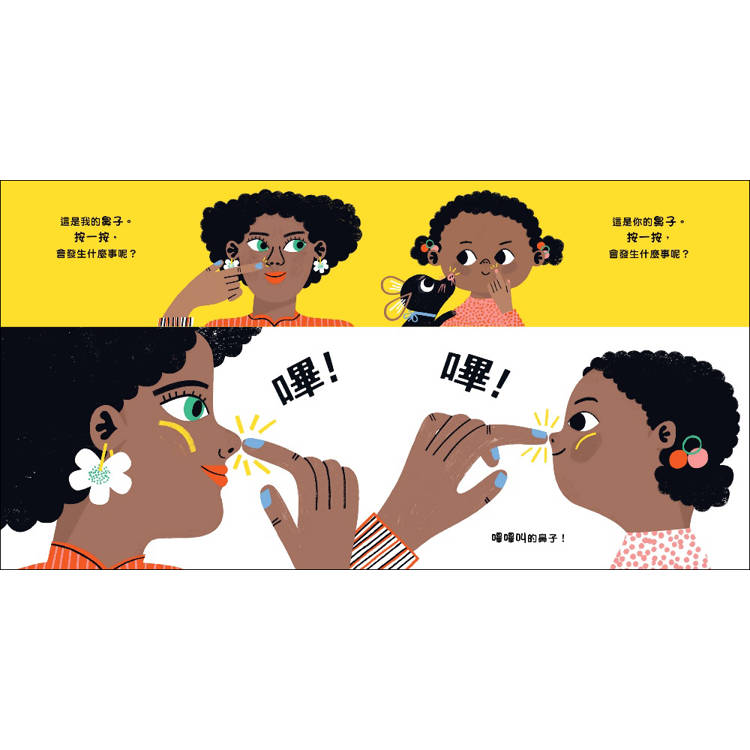 遊戲是孩子最自然的學習方式,而《你的鼻子、腳趾和肚子在哪裡?》最引人入勝的特色,就是將豐富的互動性融入閱讀體驗。父母可以透過書中的情節,輕鬆引導孩子從鼻子到腳趾,探索每一個熟悉的身體部位。這些簡單的互動動作,讓孩子在愉快的氛圍中學習,激發他們的探索慾。例如,當書中問到:「這是你的鼻子,按一按會發生什麼事呢?」時,孩子會興奮地模仿動作,期待接下來的情節發展。這些互動有助於發展孩子的感覺統合能力,並提升他們的專注力與參與感,讓孩子在遊戲中自然學習。 ――葉嘉青(幼兒教育專家&學前閱讀推廣人)