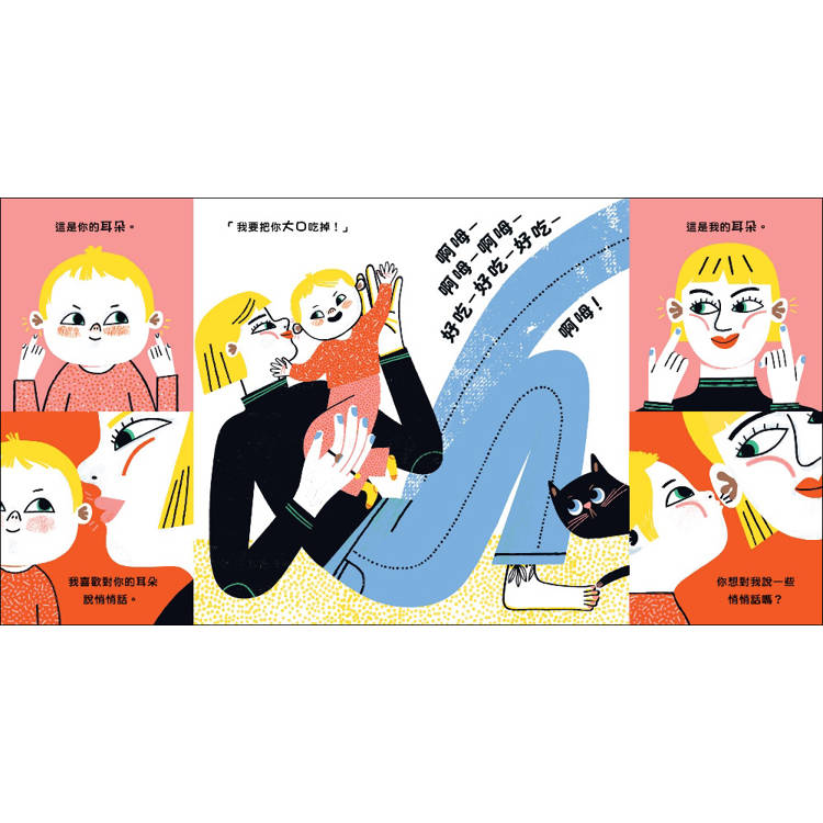 我們家在睡前會一起念這本書,小孩會一遍又一遍的表演,要大人陪他一起按鼻子、說悄悄話、親親臉頰…最後緊緊擁抱互道「晚安」。這是每天一定要的睡前儀式,看他開心滿足的模樣真的很可愛!──英國讀者‧米媽媽