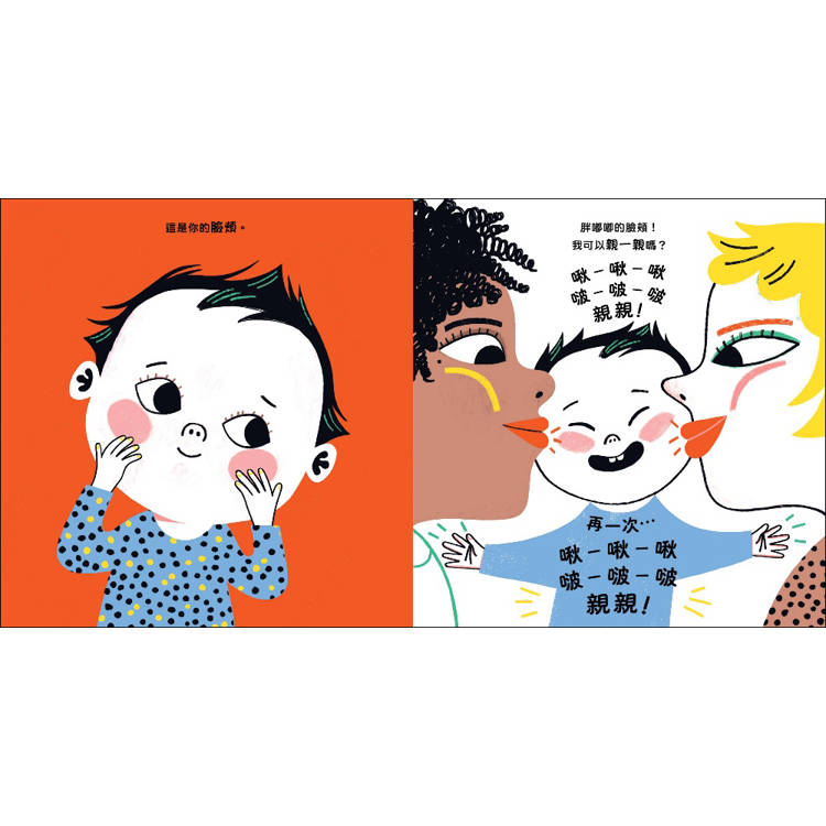 書中的提問充滿趣味與幽默感,例如:「胖嘟嘟的臉頰!我可以親一親嗎?」或「誰有圓滾滾的肚子呢?」這些玩味十足的提問讓親子共讀的過程更加生動愉快,時常引發歡笑,也為孩子創造了一個寓教於樂的學習機會。透過這些互動,孩子們能逐漸認識自己的身體,提升了語言表達能力,並在遊戲中學習協調臉部表情與肢體。