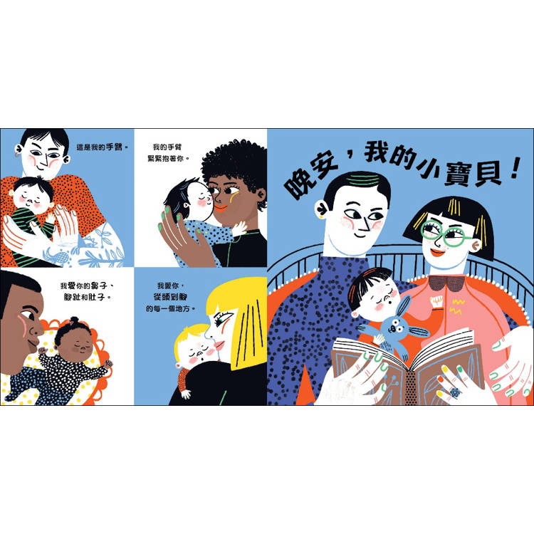 專屬家庭的甜蜜小遊戲,按一按鼻子,親親臉頰,搔搔肚子……每一個動作聚焦於一個身體部位,最後是大人用手臂緊緊擁抱,訴說我愛你――從頭到腳都愛。最後是「晚安,我的小寶貝。」孩子將在咯咯笑後,帶著滿滿的愛和安全感入睡。