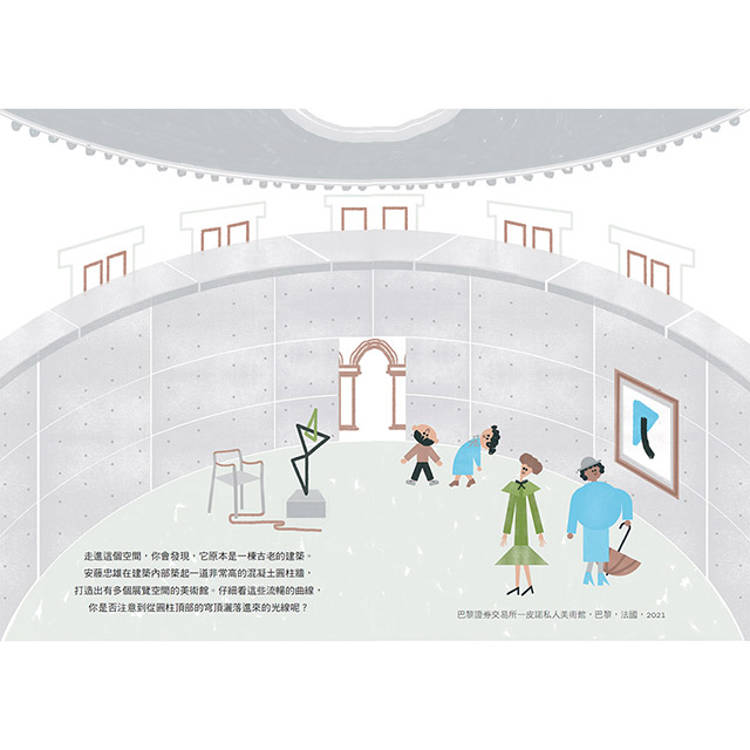接著,繪者介紹幾座體現安藤創作靈感的具體建築,這些建築的特點包涵:融入自然與環境、光線帶來節奏與靈感、清水混凝土的「平滑與柔和」,以及建築最基本的功能性:為人的需求而設計。