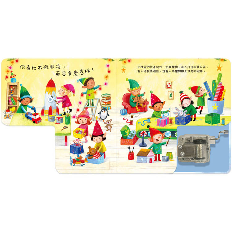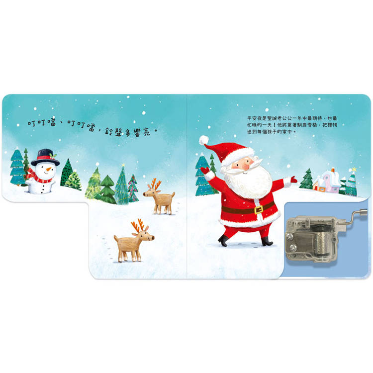 《轉吧轉吧發條音樂盒》系列結合節慶故事、精美插畫與音樂互動的精裝硬頁書,是親子共讀、認識聖誕歌曲的最佳選擇。跟著優美旋律,一頁頁跟著聖誕老公公準備禮物,讓孩子感受聖誕節的溫馨與奇蹟!