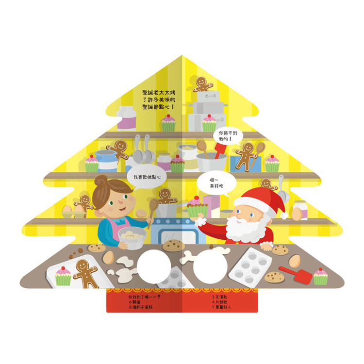 每一頁還有找找看小遊戲,尋找拐杖糖、聖誕襪、杯子蛋糕、薑餅人……適合親子一起尋找,共度快樂的時光。